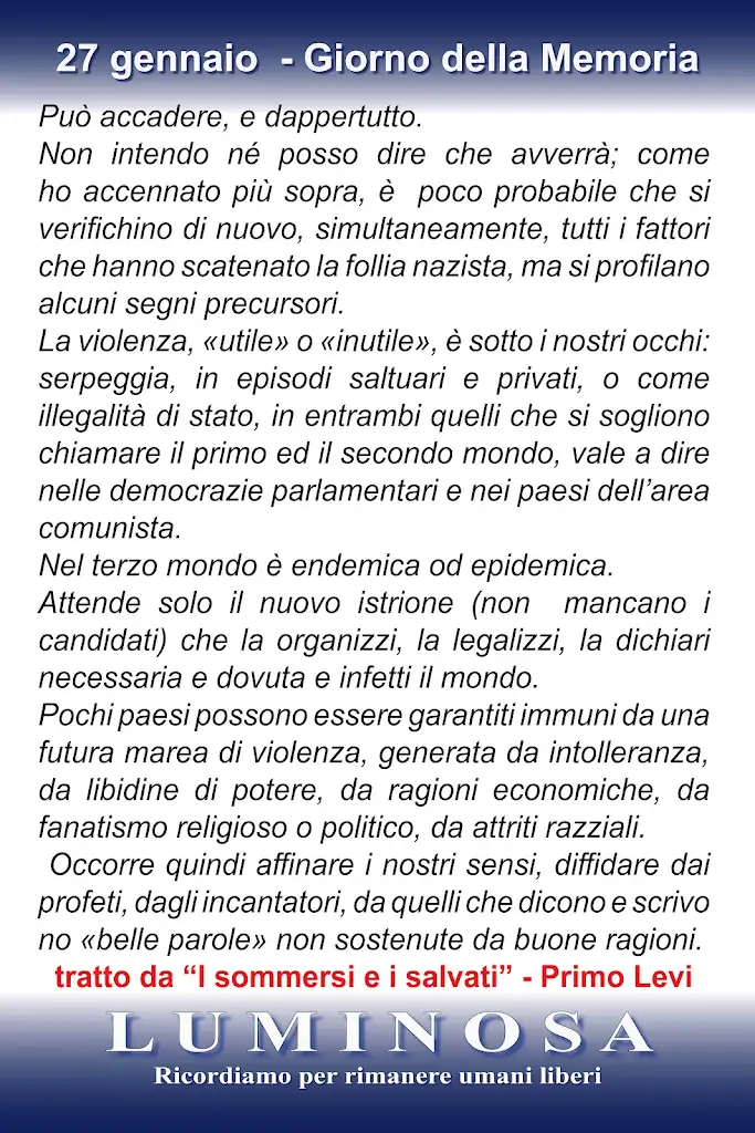 E’ difficile parlare con i giovani ma è necessario farlo. Precisato che è lontano da noi il volere dare consigli o condizionare docenti e studenti, Luminosa rende disponibili per il 27 gennaio: