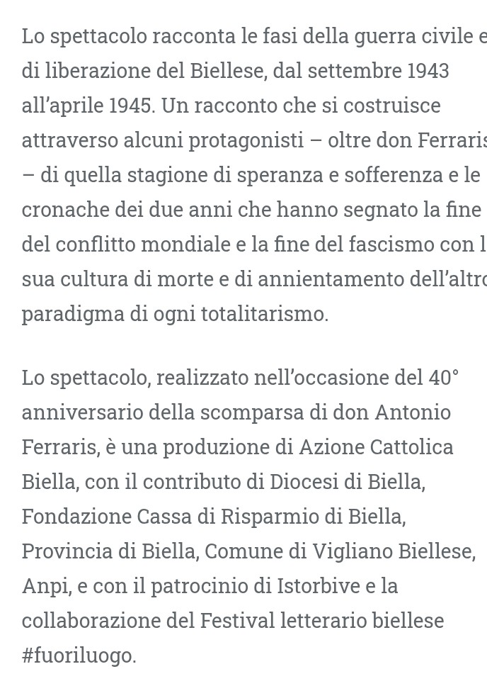 …e allora il 10 ottobre, noi della quinta elettro, accompagnati dalla prof.sa Garella, ci siamo recati a Vigliano al teatro Erios, per assistere allo spettacolo di Emanuele Policante e Gianfilippo Caligaris liberamente tratto da Sacerdoti Biellesi nella bufera 1943-45 di don Antonio Ferraris. Attraverso un lungo monologo, sullo sfondo di una scena essenziale, animata dalle luci di Eddy Romano, abbiamo così sentito le voci e le testimonianze lasciate dai protagonisti di quella stagione interrogandoci sul nostro presente.